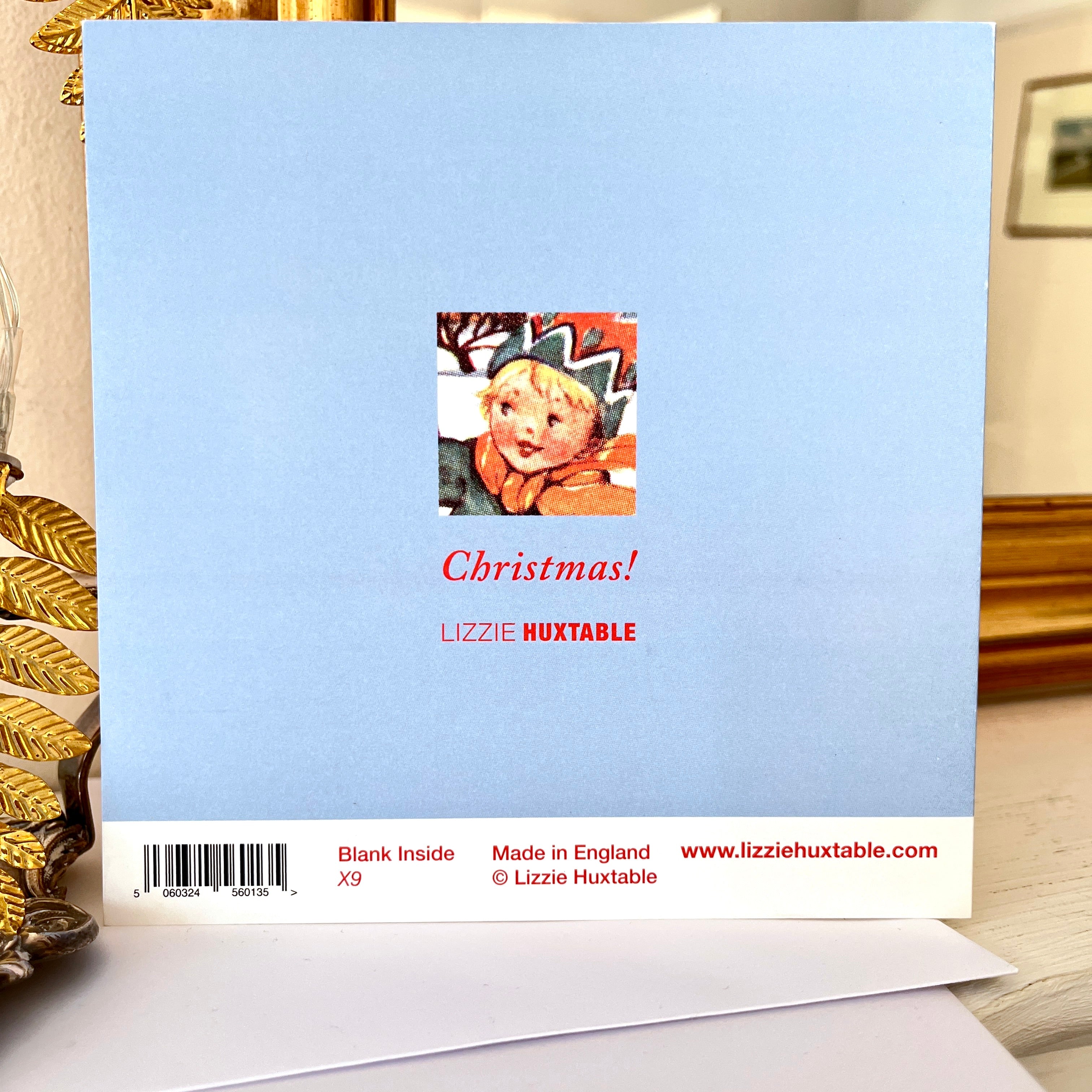 Charming image edited from a tiny original 1930's card; nostalgic charm including the cute gaiters the little boys are wearing to keep the snow out! A lovely card for kids to send grandparents and aunts and uncles. UK made exclusive to LHD