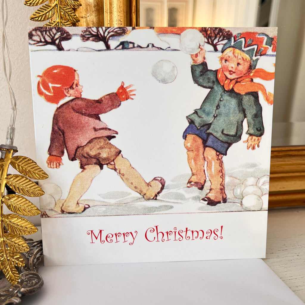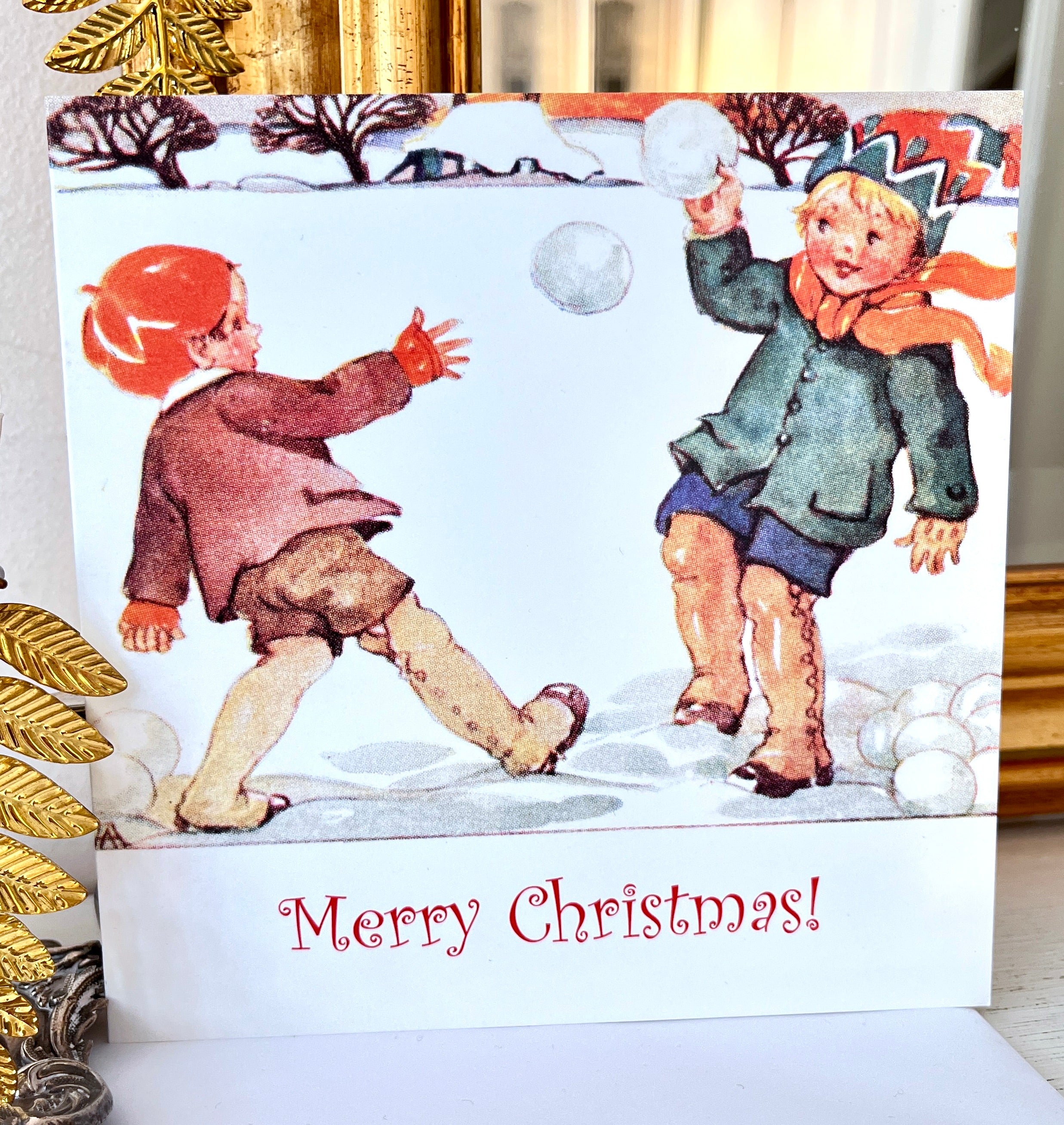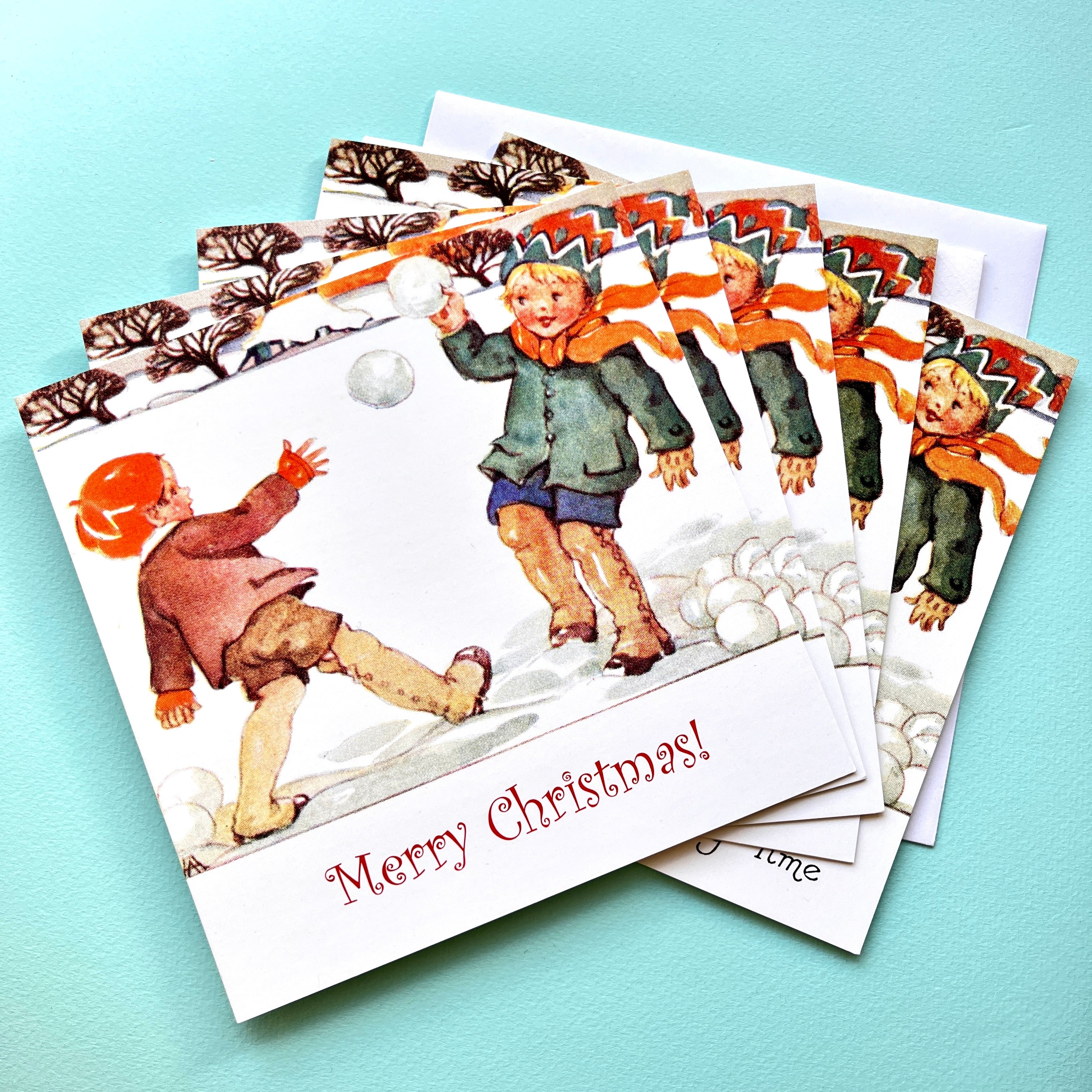 Cute vintage style 1930's Christmas card 5 pack little kids snowballing