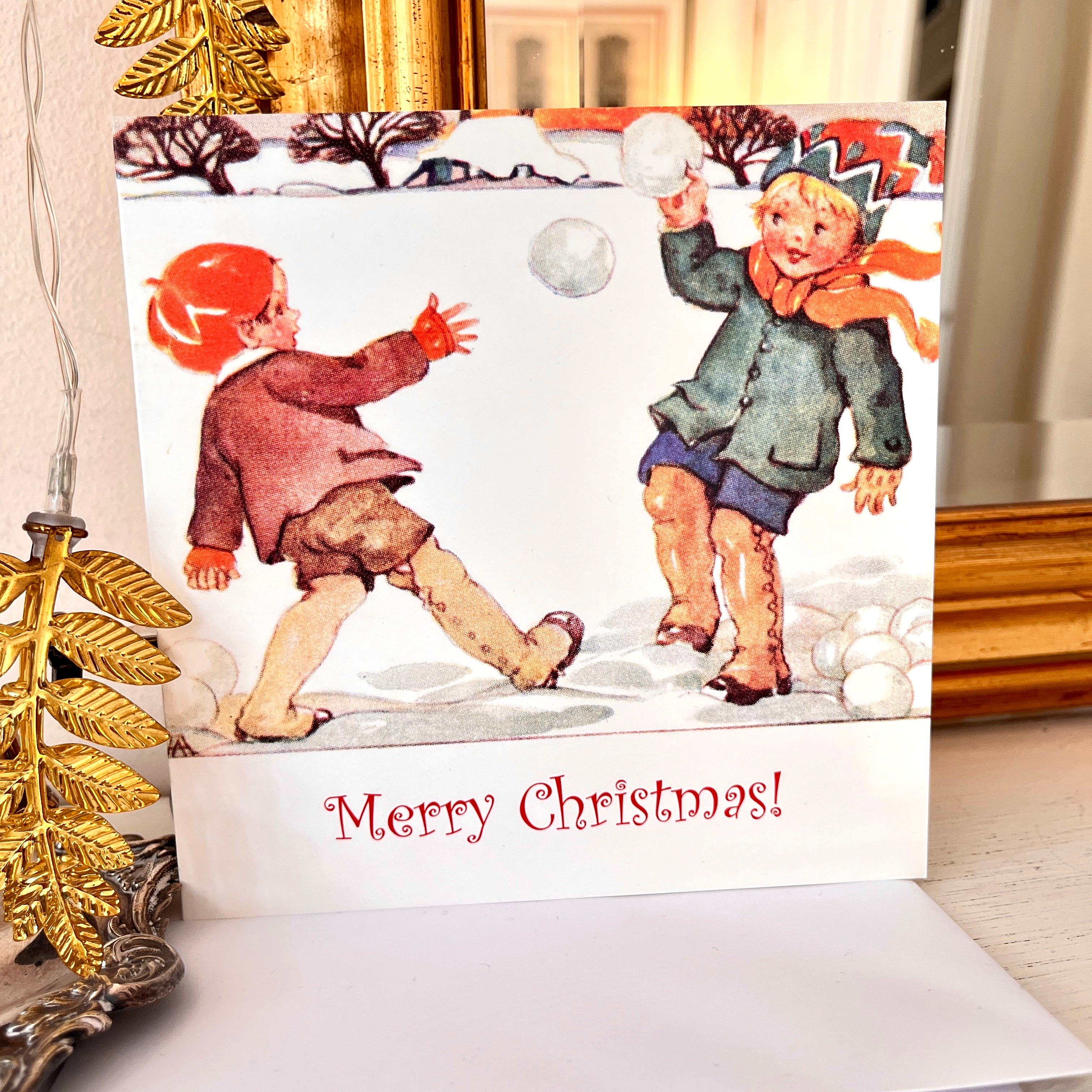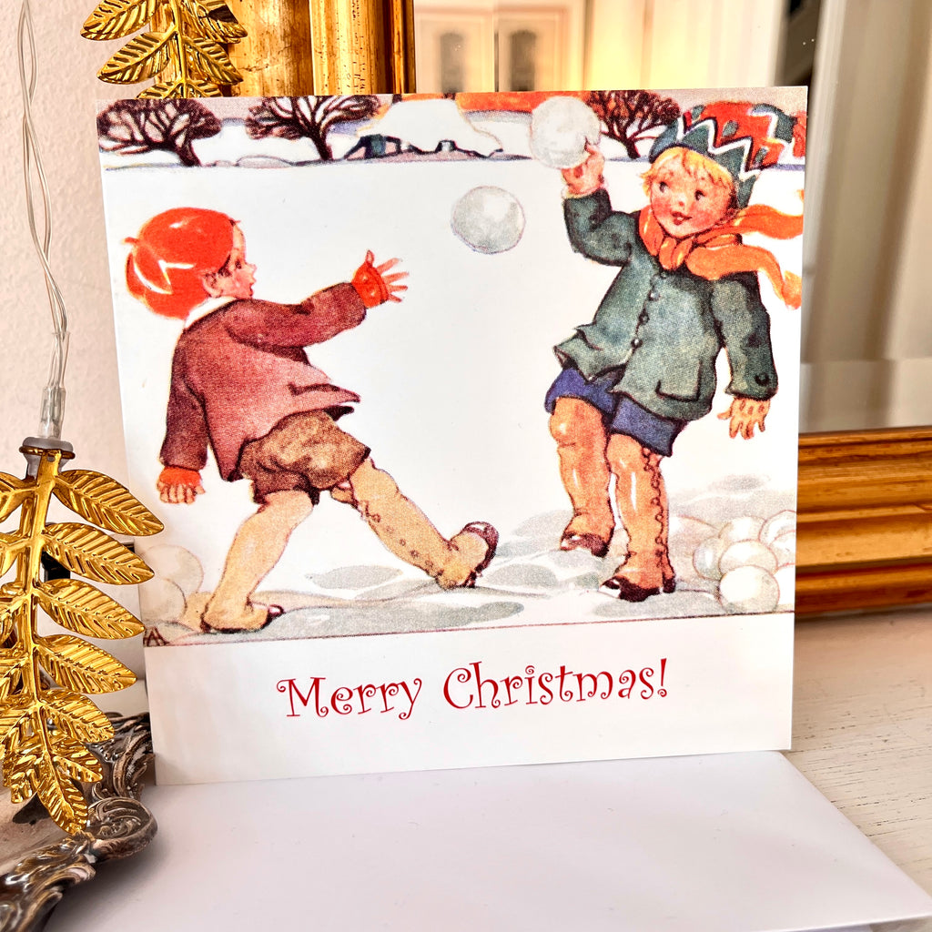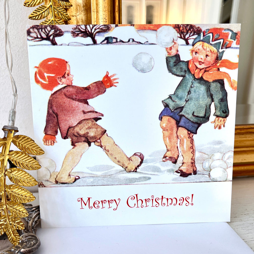 Cute vintage style 1930's Christmas card 5 pack little kids snowballing
