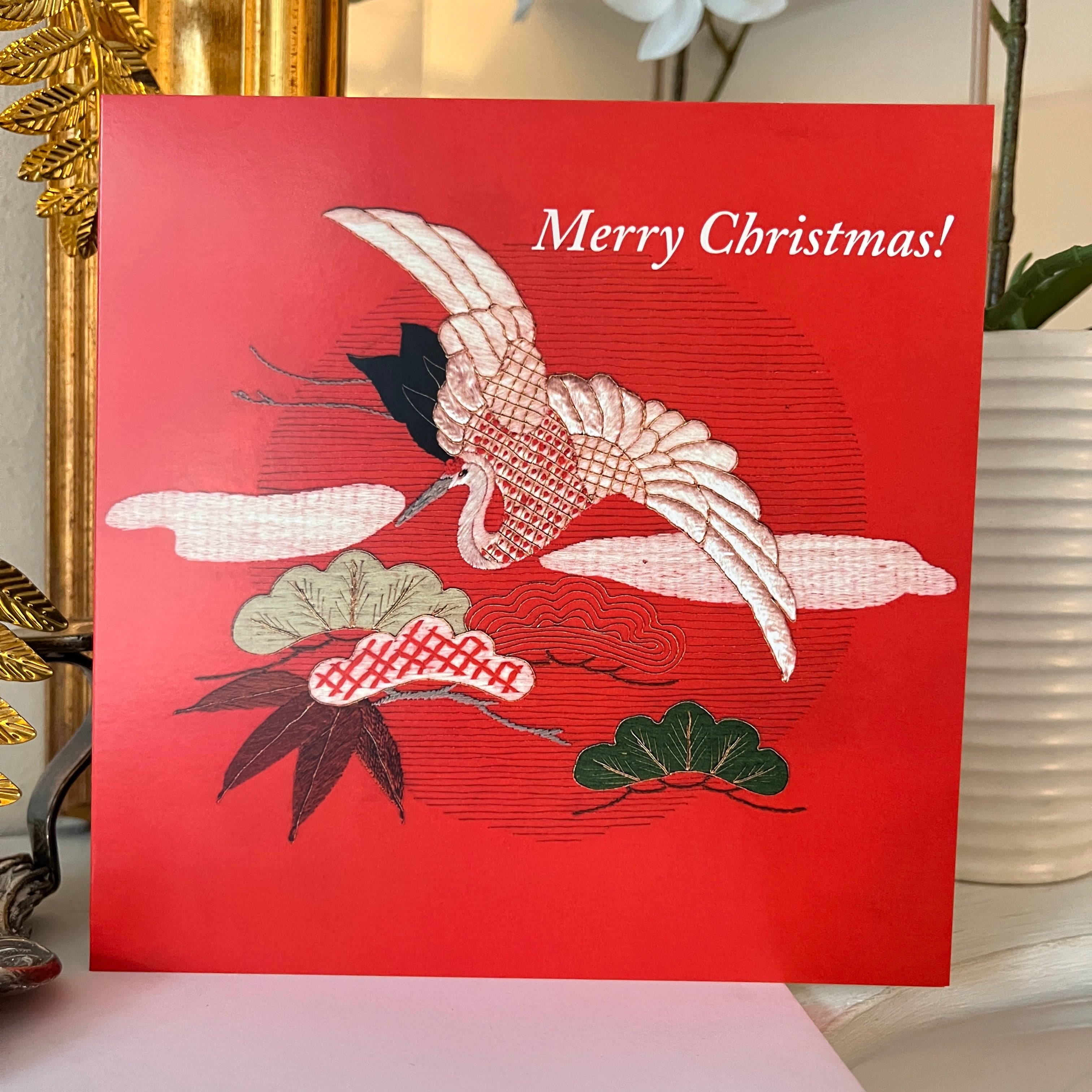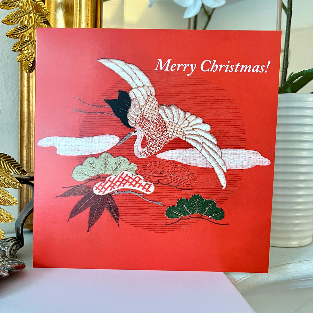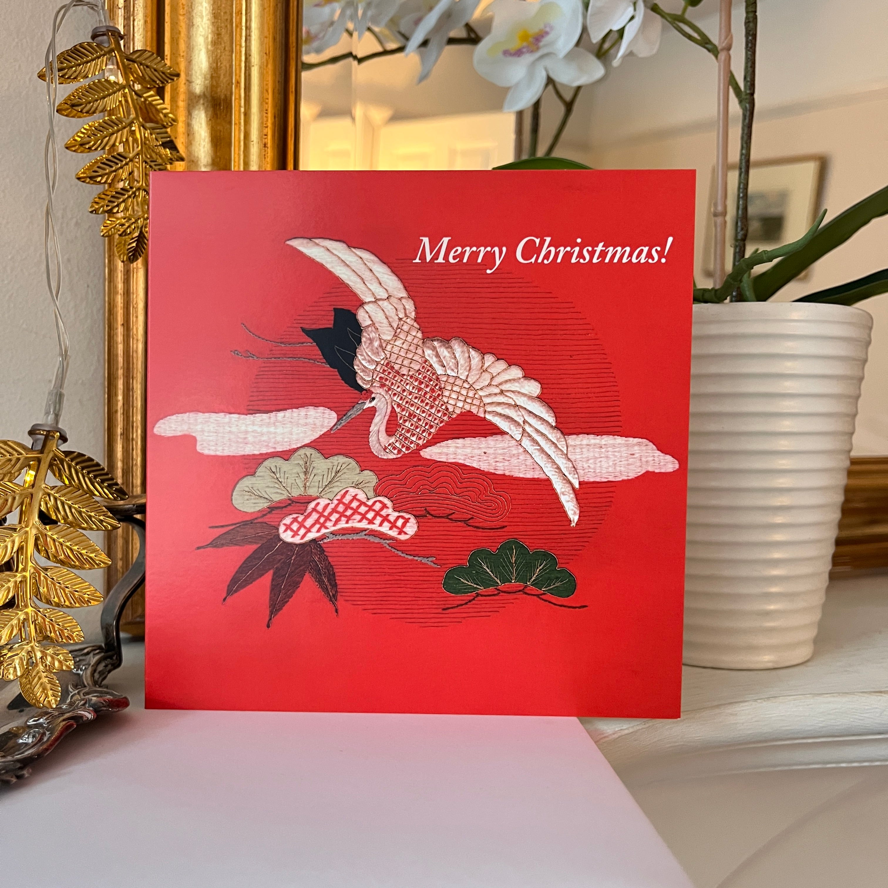 Brilliant red silk, with ivory and golden embroidery from a lovely vintage Japanese textile make a gorgeous Christmas card; UK Made, blank inside for special messages.